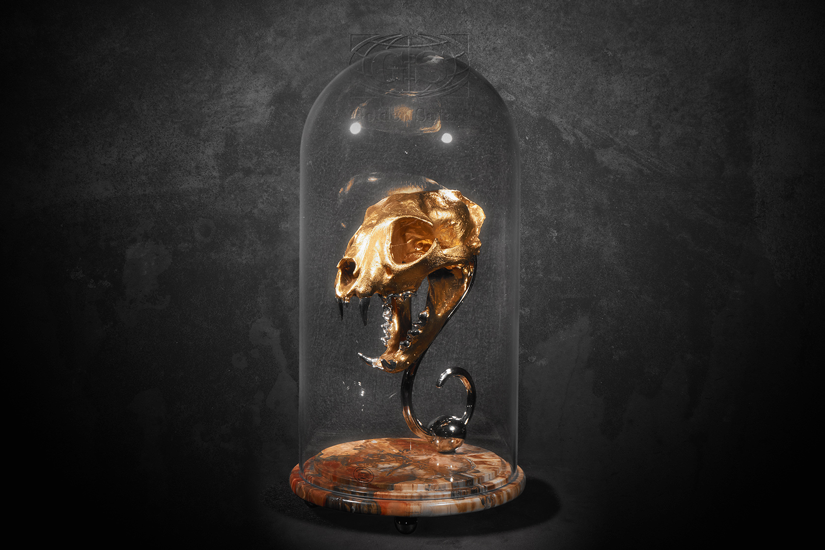 Код изделия / Item code ................................................. 1.1.02.001.0001.4600 Количество скульптур в серии / Number of sculptures in the series .............. 1 Материал / Material ................................................................................ Ag .925° Вес / The weight .................................................................................... 214,66 г/g Черепная часть скульптуры покрыта золотом ..................................... Au .999° Gold-plating of the cranial part of sculpture ......................................... Au .999° Медальон выполнен из окаменелого дерева Pedestal: Petrified wood
